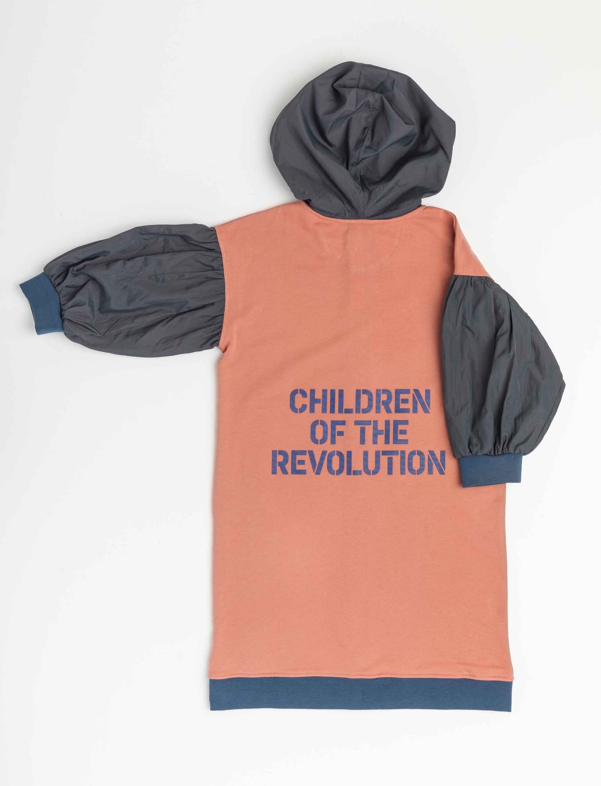 Maxi sudadera con capucha y manga francesa fruncida de plana a contraste. Cremallera central, bolsillos laterales y gráficos en delantero y trasero a contraste.