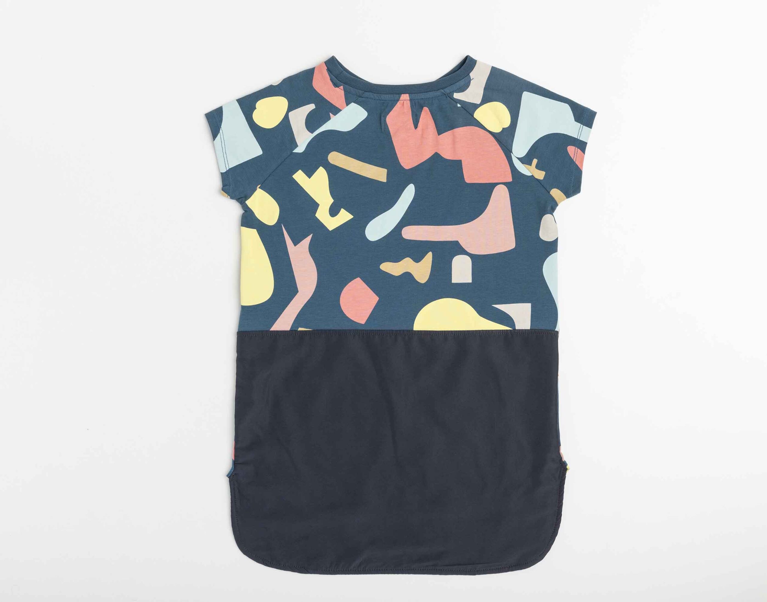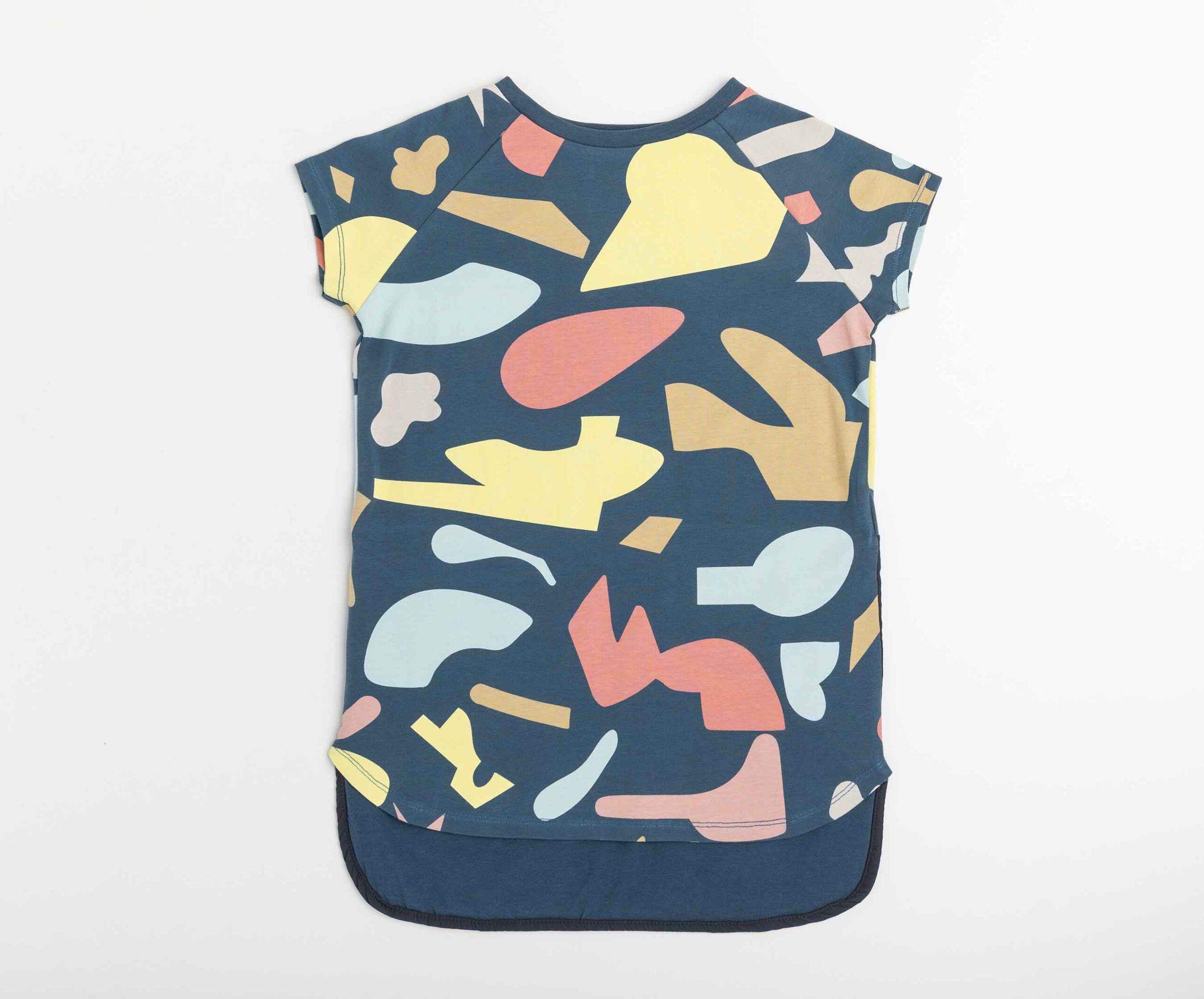 Vestido camiseta estampado con manga raglán corta y trasero más largo con detalle de plana a contraste.